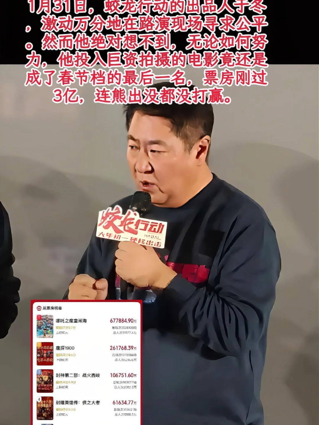 眼见《蛟龙行动》在春节档票房和口碑失利后,博纳老板于冬不仅归咎于“饭圈恶意差评”,还推出“不满意可退票”措施,被观众嘲讽“输不起”。他路演时高喊“绝不撤档”的豪言壮语,最终灰溜溜撤档,真是惨遭打脸!