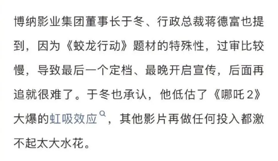 于冬在接受采访时,对《蛟龙行动》的亏损原因做出了解释。他首先提到,严重低估了《哪吒2》的市场统治力是关键因素。