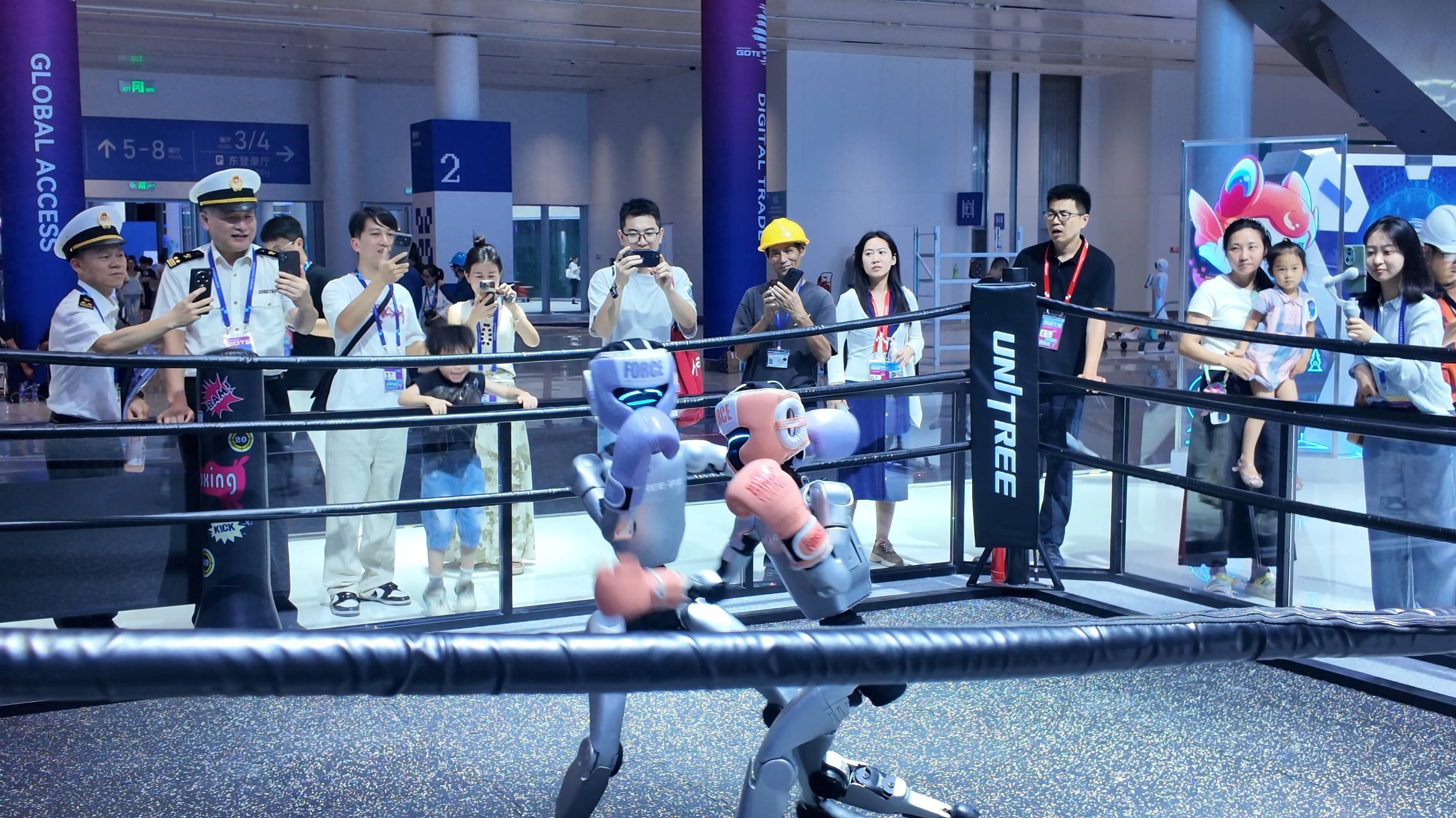 在数智未来展区,宇树科技带来的Unitree G1人形机器人成为焦点。两台机器人灵活施展“勾拳”“抬腿”等格斗动作,即使被击倒也能迅速自主起身,引得观众连连喝彩。